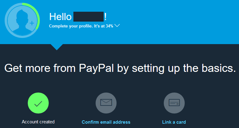 4-بذلك تكون قد أتممت خطوات تفعيل حسابك على باي بال وستجد ان ملفك الشخصي مُكتمل بنسبة 100% كما هو موضح بالصورة التالية، وهذا ليس معناه أن خاصية سحب الرصيد من باي بال مُفعلة إذ أنه من المحتمل أن توجد خطوات إضافية تختلف من بلد لآخر.